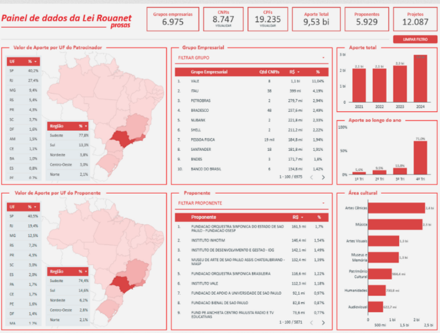 O Ministério da Cultura informou em reportagem e balanços recentes sobre a Rouanet, que a Lei Rouanet alcançou em 2025 captação recorde de R$ 3,41 bilhões, crescimento de 12,1% em relação a 2024 e de 45,1% frente a 2023, com 4.866 projetos em execução nas 27 unidades federativas, 22.971 propostas submetidas e 14.847 autorizadas. Sustentando que esse desempenho reflete uma política de nacionalização do incentivo cultural e maior equilíbrio regional, evidenciado pelo crescimento de 81,4% na Região Norte (R$ 117,2 milhões), 96% no Centro-Oeste (R$ 128,2 milhões), 57,4% no Nordeste (R$ 233,9 milhões), 36,3% no Sul (R$ 479,7 milhões) e 42,4% no Sudeste (R$ 2,45 bilhões), além de uma redução da concentração da captação em dezembro de 63,1% em 2023 para 44,5% em 2025 (números que não batem com outros estudos, que revelam maior concentração do que anunciada na captação final).