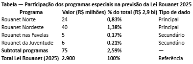 Reconhecemos a importância dos programas especiais criados pelo Ministério, como Rouanet Norte, com R$ 24 milhões captados junto ao Banco da Amazônia, Banco do Brasil, Caixa e Correios, Rouanet Nordeste, com cerca de R$ 40 milhões, Rouanet nas Favelas, com cerca de R$ 5 milhões, e Rouanet da Juventude, com cerca de R$ 6 milhões, além do Programa Emergencial do Rio Grande do Sul. Esses programas são relevantes e necessários, mas representam ilhas de correção dentro de um oceano estruturalmente concentrador. Eles atenuam sintomas, mas não alteram o desenho central do sistema.