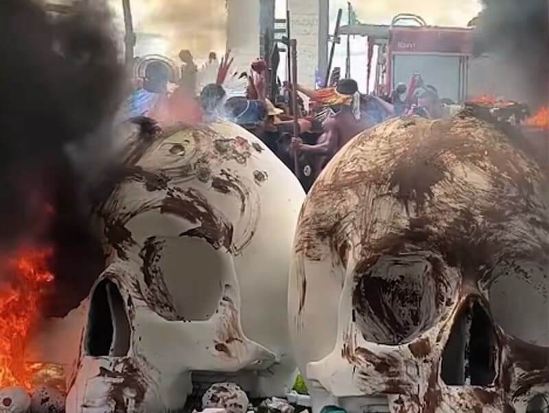 Indígenas ateiam fogo a caveiras em ato em frente ao Congresso