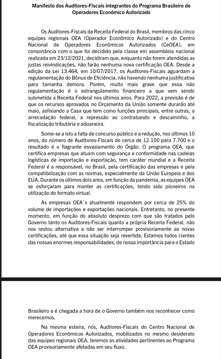 Receita Federal, os auditores que compõem as centrais de Operadores Econômicos Autorizados (OEA) declararam que não vão emitir certificações enquanto não forem atendidas as demandas da categoria. OEAs são auditores e demais profissionais responsáveis por analisar se empresas de importação e exportação no Brasil estão atendendo às normas de segurança internacionais.