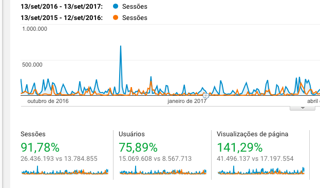 É inédito, no entanto, o patamar de audiência acumulada nos últimos 12 meses. Sempre de acordo com o Google Analytics, mais de 15 milhões de usuários acessaram 41,5 milhões de páginas no período, contabilizando cerca de 26,5 milhões de visitas.