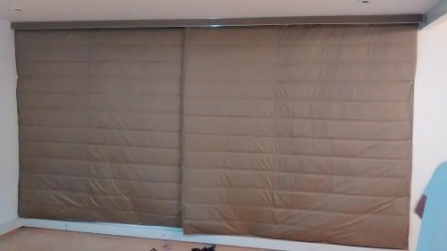 A segunda opção que ajuda a atenuar o ruído é a cortina acústica, ela é, geralmente, recheada com duas camadas de espuma acústica de 10mm e uma camada canadense de lã de rocha ou de pet. Para o acabamento, conta uma camada de poliéster. Ela tem uma razão muito mais functional que estética, sendo assim, aconselhamos colocar uma cortina para cobrir e deixa-la funcionando como um blackout sonoro.