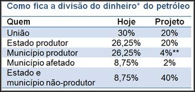 *Royalties, sem incluir participações especiais. **Percentual em 2020. Fonte: PLS448/11 - Jornal do Senado, 20.out.2011