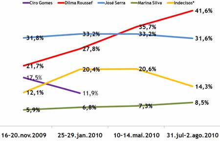 Nas últimas quatro pesquisas, verifca-se que Dilma Rousseff quase dobrou as intenções de voto. No levantamento feito em novembro do ano passado, quando ainda não havia definição sobre quais seriam os candidatos, ela aparecia com 21,7%, contra 31,8% de José Serra. Na pesquisa seguinte, divulgada em fevereiro, no cenário em que aparecia a senadora Marina Silva, a diferença era de aproximadamente 12 pontos a favor do tucano.