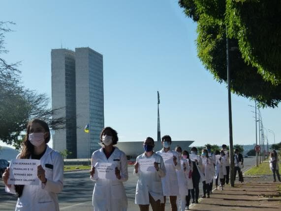 Sem pagamento, residentes fazem manifestação em frente ao Ministério da Saúde